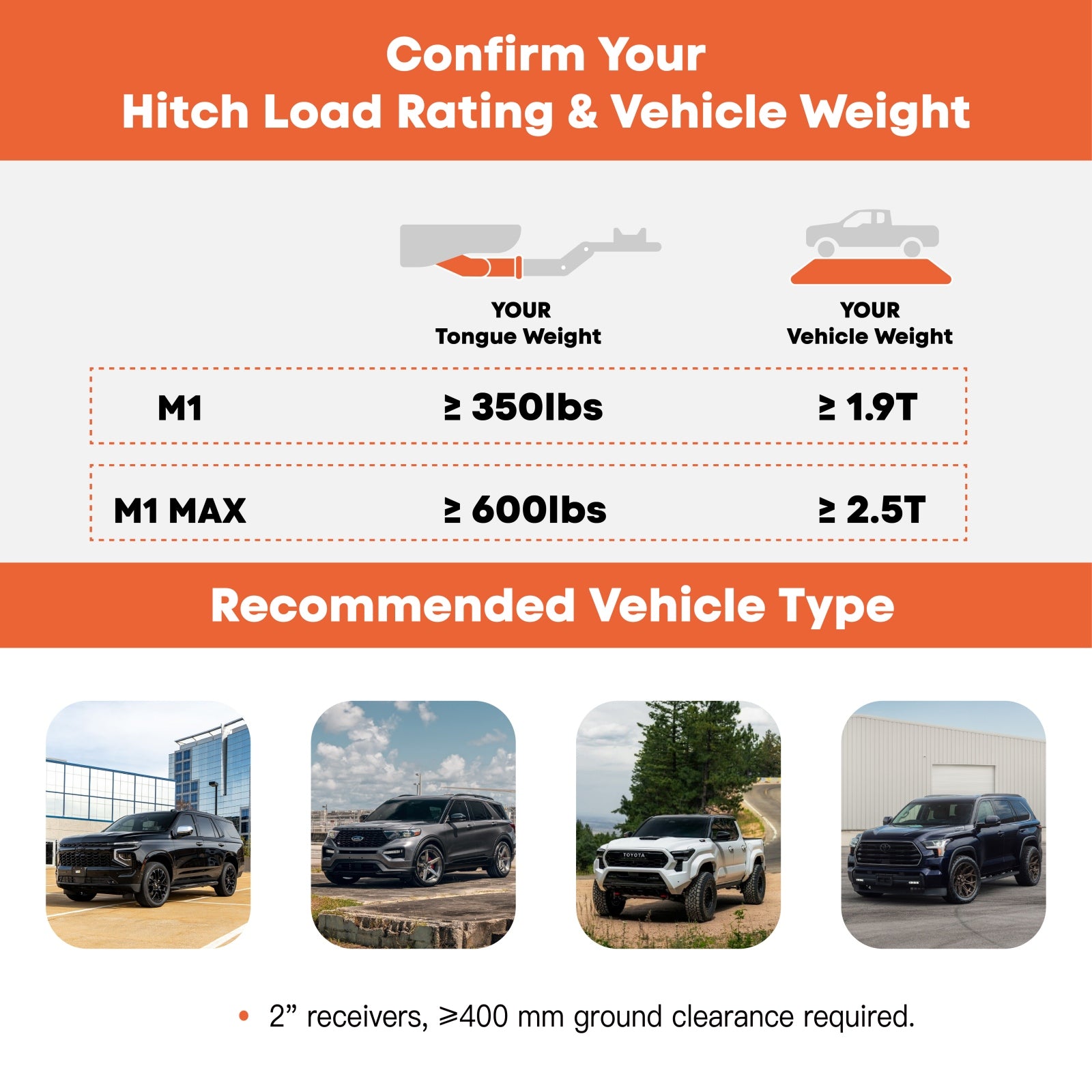 Ensure your vehicle has a Class IV or higher 2" receiver before buying the M1 Max.