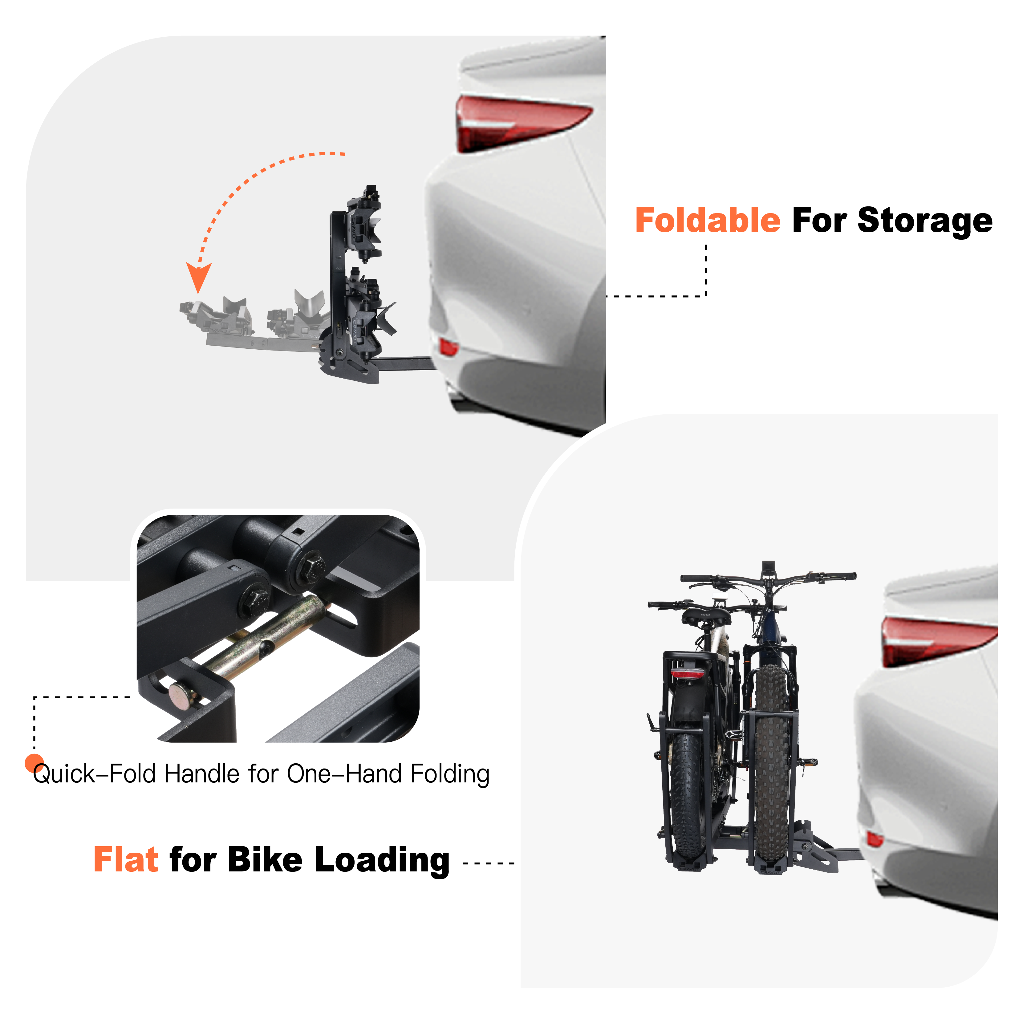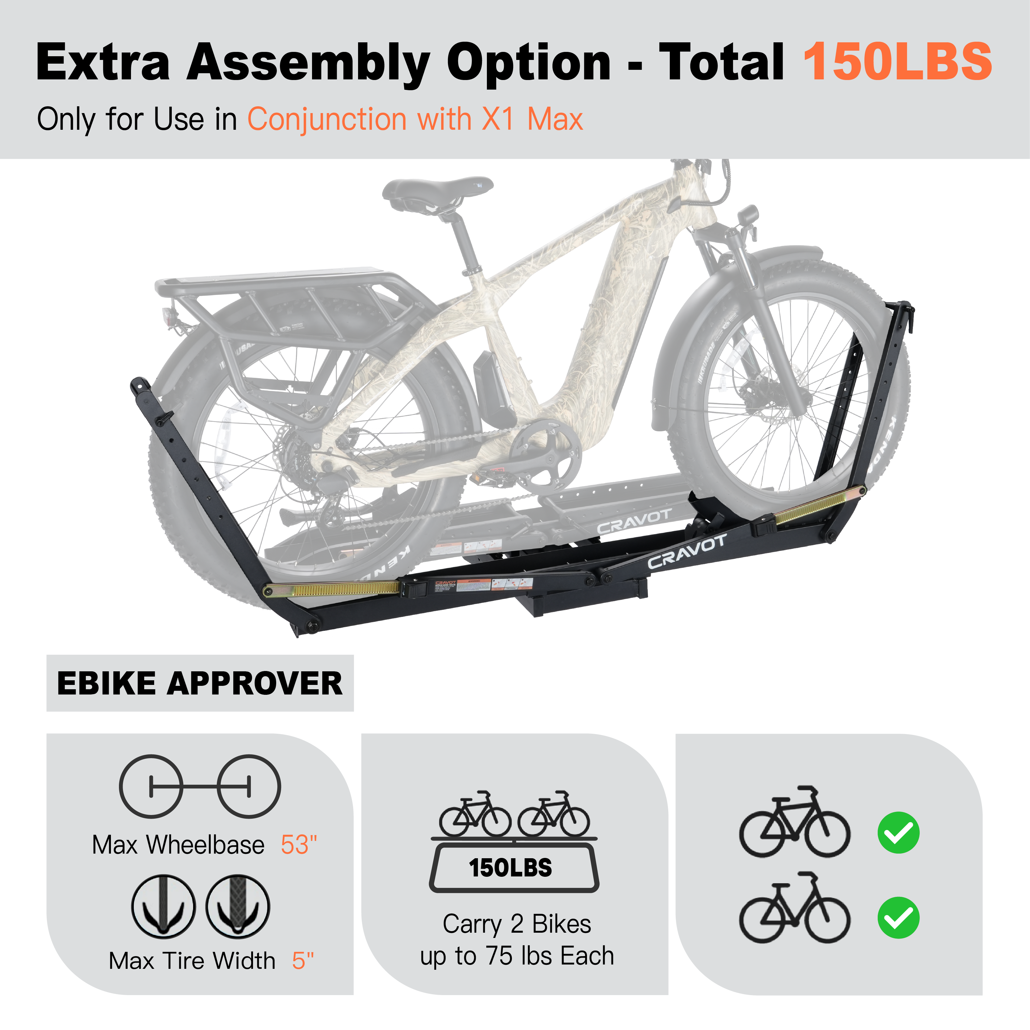 Upgrade your X1 Max with XA Max to carry two bikes (75lbs each, 150lbs total). With a 53" wheelbase and 5" tire width, it fits both step-through and step-over designs thanks to its smart tire-mount system.