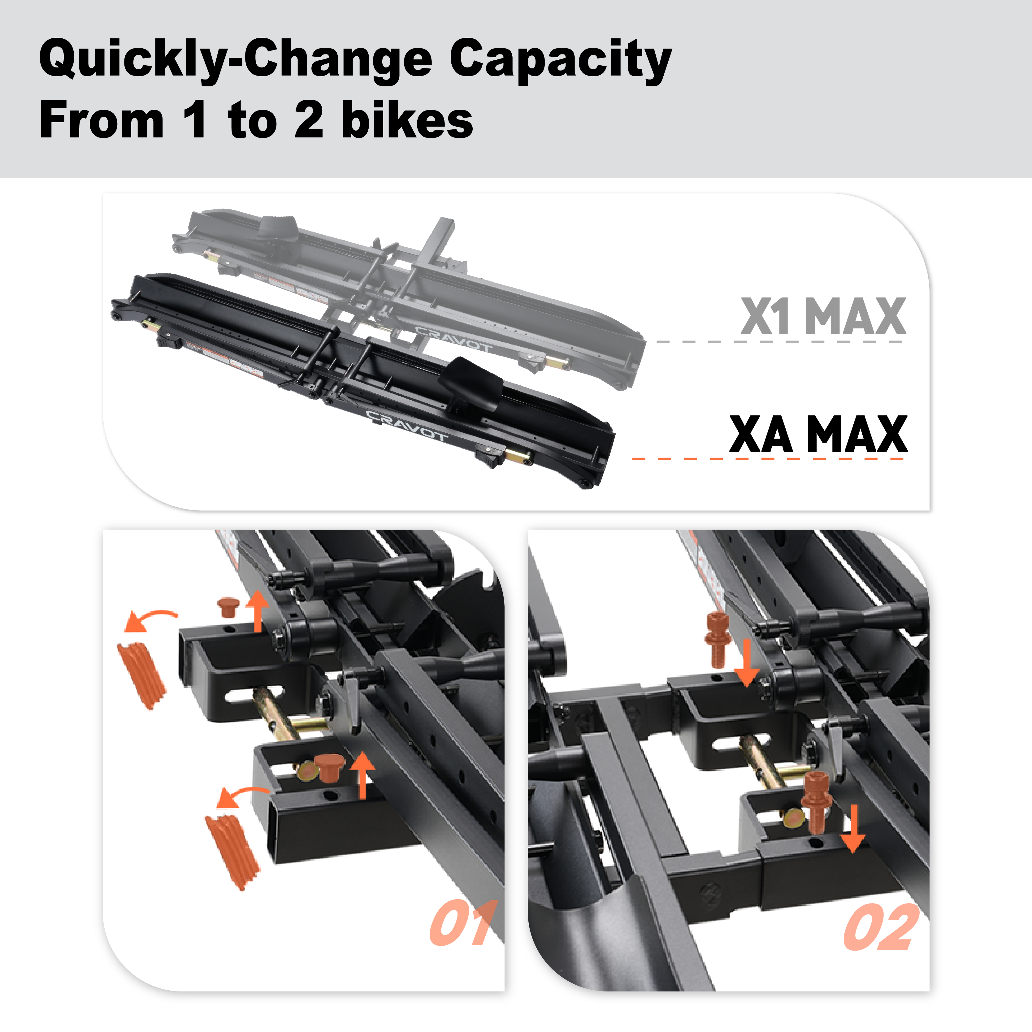 XA Max is the perfect companion to your X1 Max, with easiest steps, effortlessly increasing your capacity from one bike to two, and from 100lbs to 200lbs.