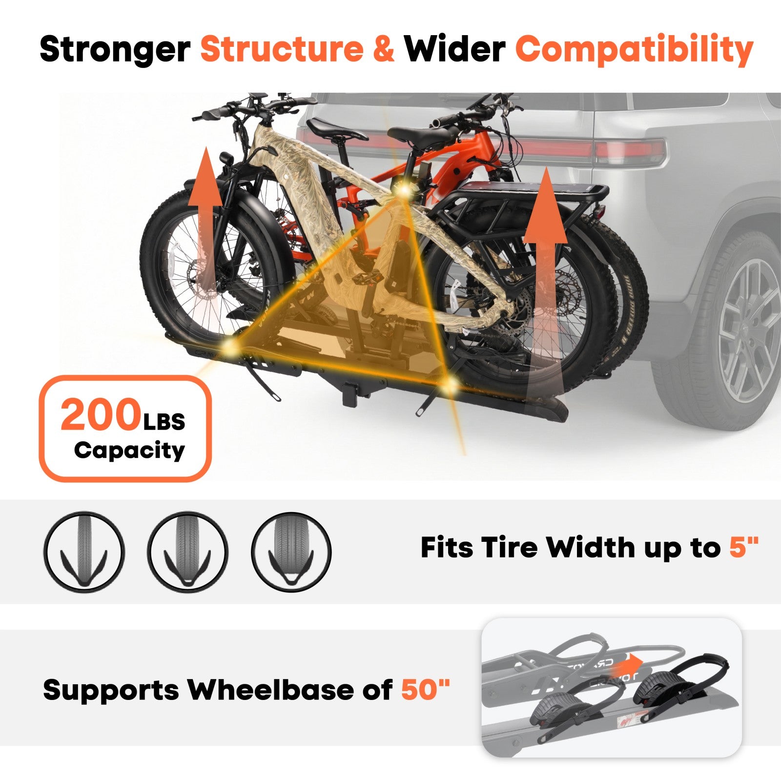 Three-point mounting system ensures stability while supporting up to 200 lbs, fitting most mid-to-large e-bikes with wide tires and extended wheelbases.