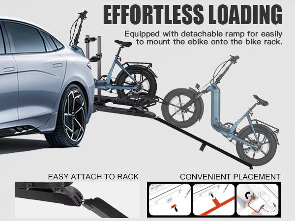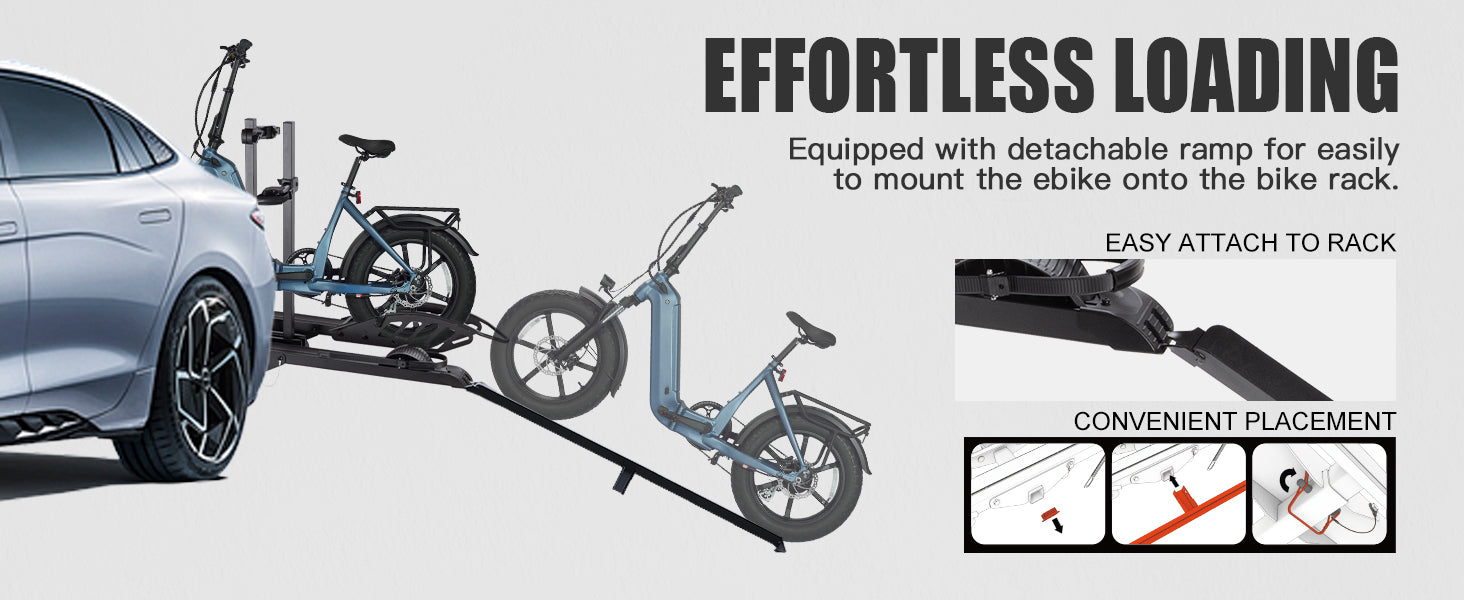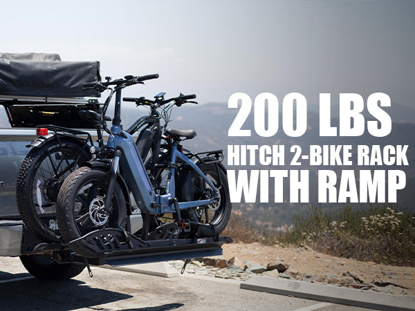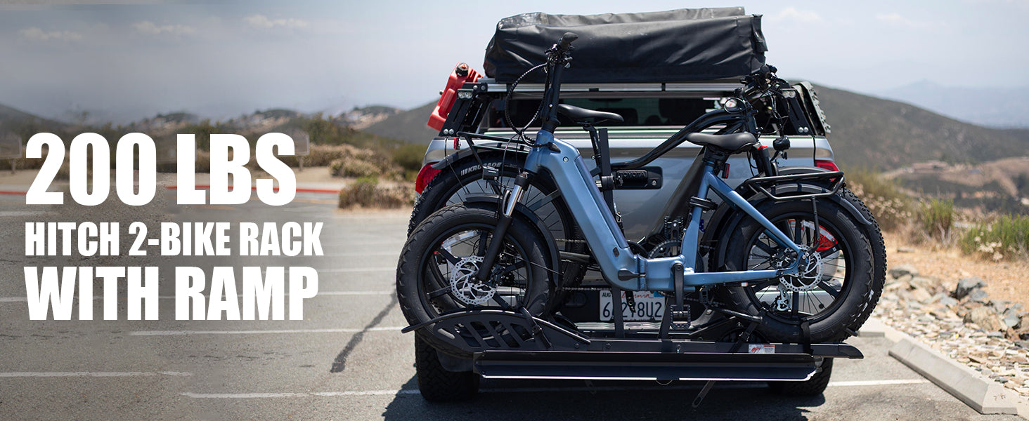Mate R – the ultimate bike rack for effortless, secure, and convenient e-bike transportation. Designed to support up to 200 lbs (100 lbs per bike), it offers exceptional strength and stability. Featuring a built-in ramp for easy loading and unloading, this innovative rack also provides compact storage when not in use. With its foldable ramp, you’ll never have to deal with cumbersome equipment again.